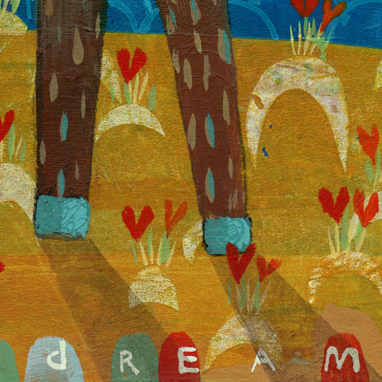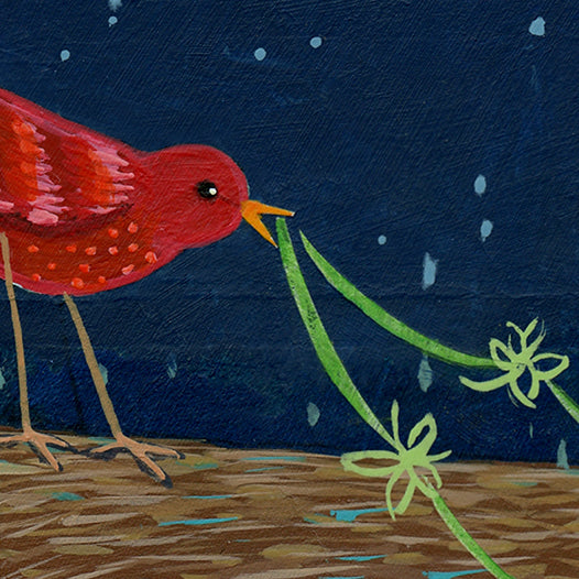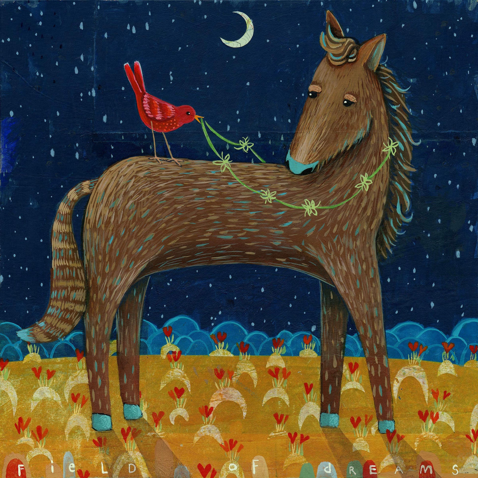 In this field where heart-shaped flowers bloom, the chirpy red bird offers a clover rein to her friend as they go for a little walk. A beautiful night for a trot! - Judy