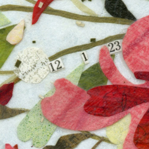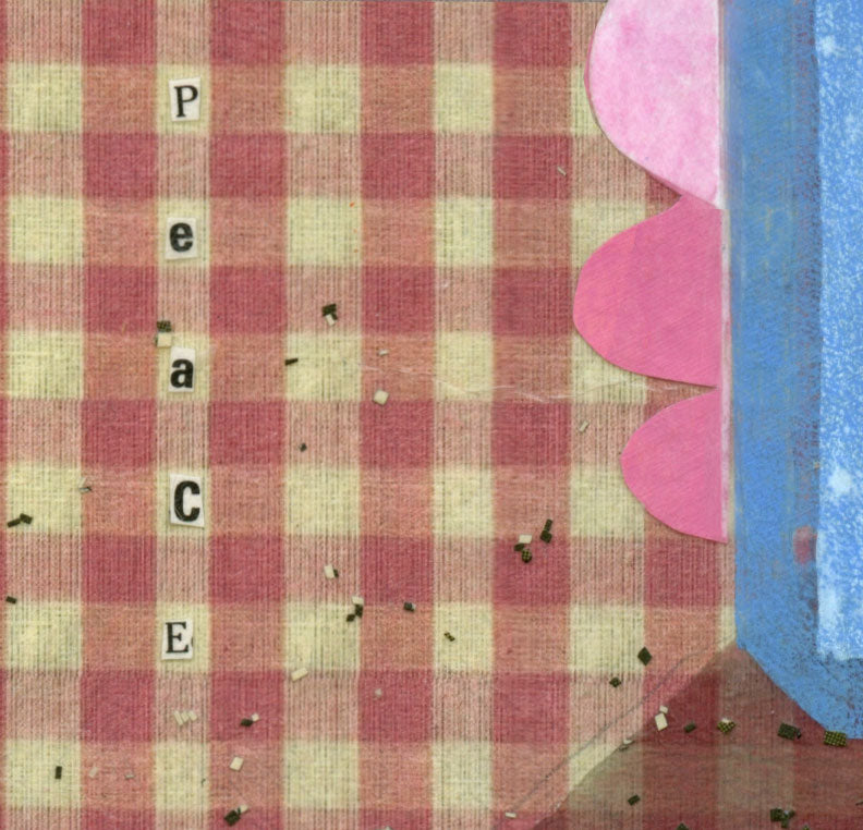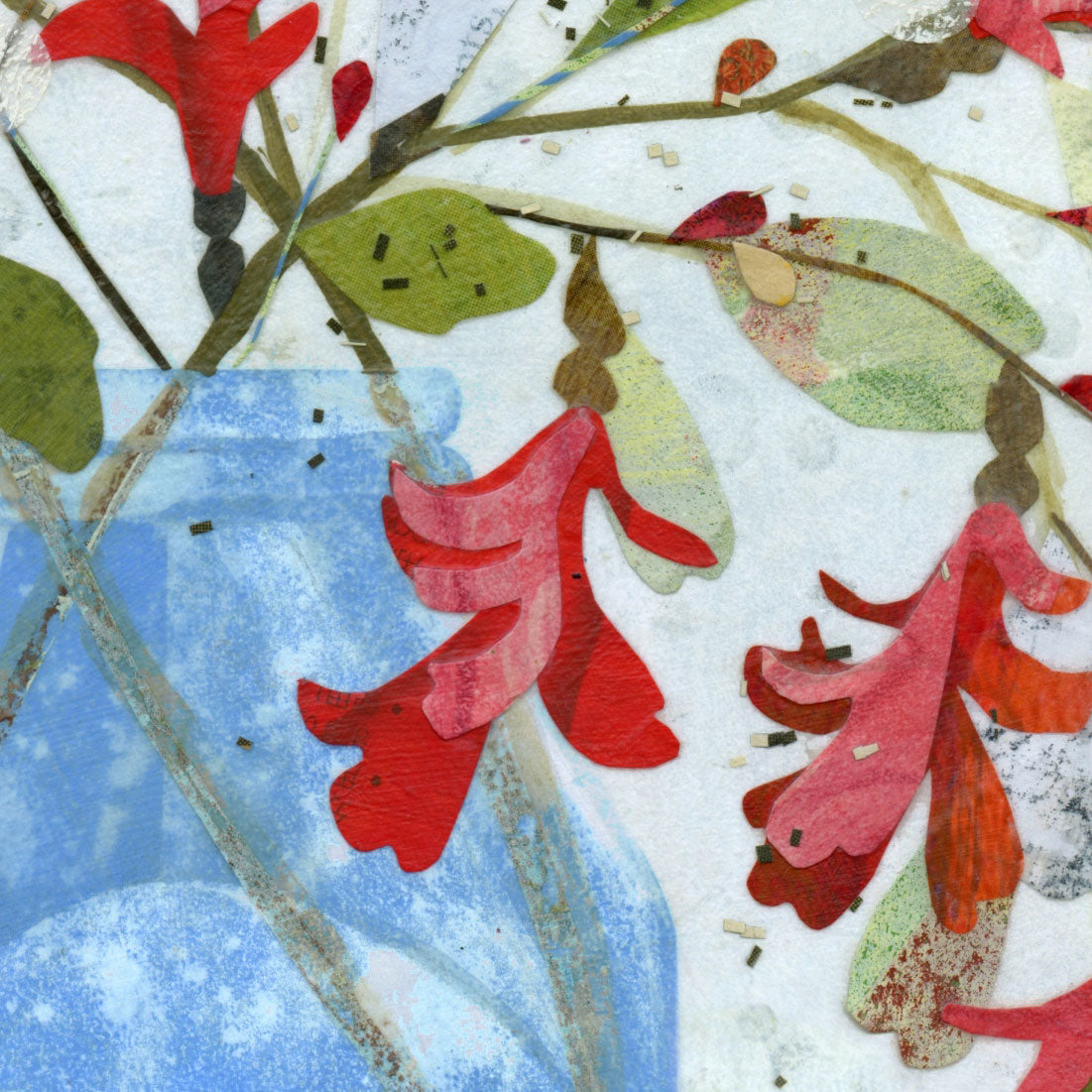 I looked in my blue paper flat file drawer, and found a piece I had painted which reminded me of the faded blue jar Kirsten had given me. It became the inspiration for this art. The gingham tablecloth is also a reminder of her kitchen table surrounded by windows on three sides, where a group of us moms would sit for hours and talk about our kids, our fears for them, our triumphs big and small. - Judy