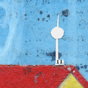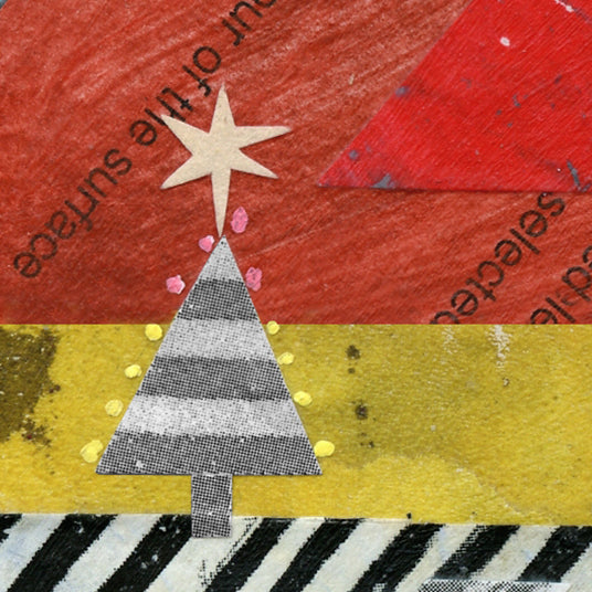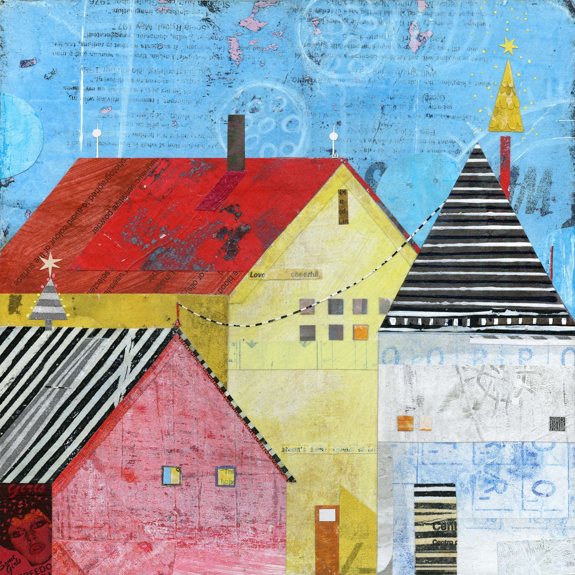 In this art, the first in a series of four pieces, I’ve combined Bisbee, AZ with an imaginary seaside village I call “Bisbee-on-Sea”. The villagers here are a hearty, cheerful bunch who adorn their rooftops with a quirky variety of decorated trees during the holiday season!