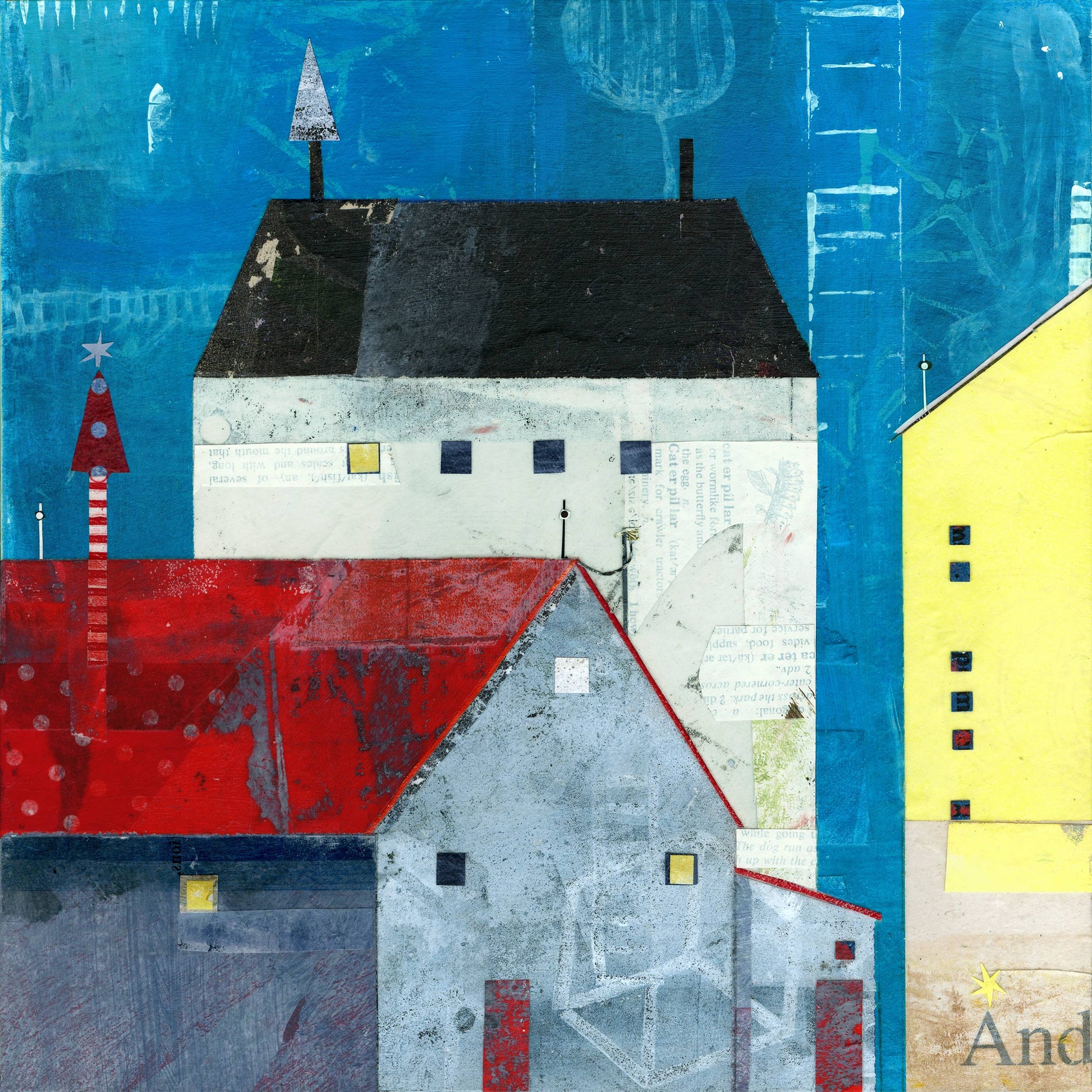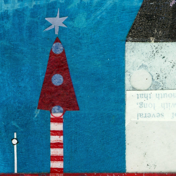 This art is number two in a series of four pieces. It’s Thursday in my quaint imaginary village I call Bisbee-on-Sea. During the holidays, the townspeople bake krill cookie treats for the local sea gulls. These cookies are shaped like candy canes and then hung on the rooftop trees. The gulls sure do enjoy these delicious decorations!